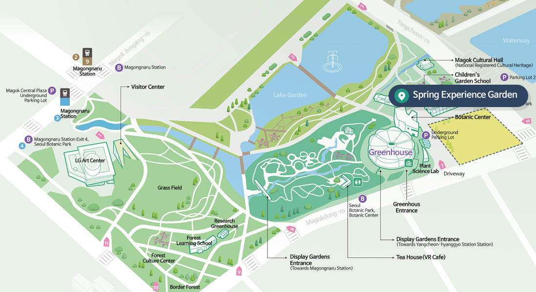 SubwayLine 9 Yangcheon-hyanggyo Station Exit 8 → Walk 5 minutes toward Seoul Botanic Park