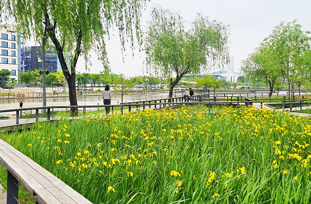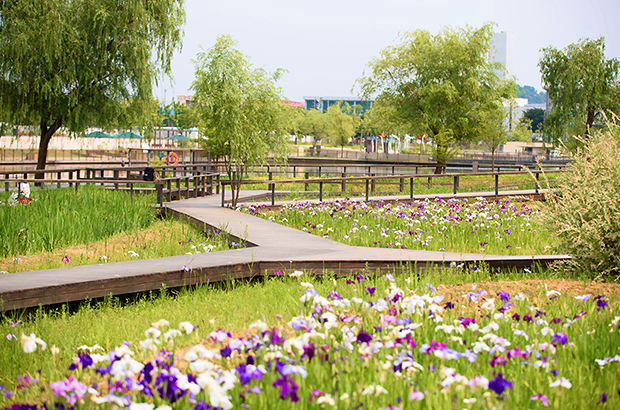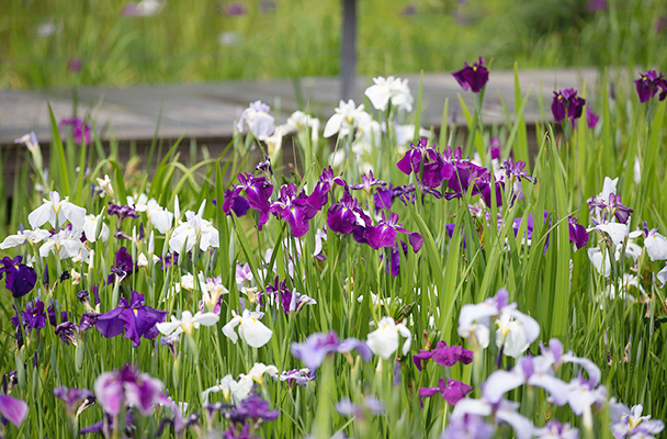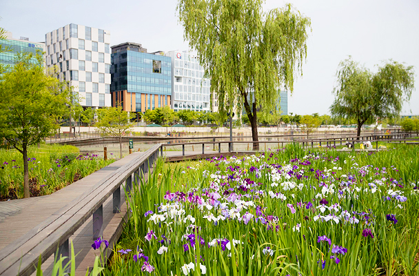 붓꽃, 연꽃, 버드나무에 물소리가 어우러진 아이리스원은 마음을 편안하게 해주는 수생식물 정원입니다.