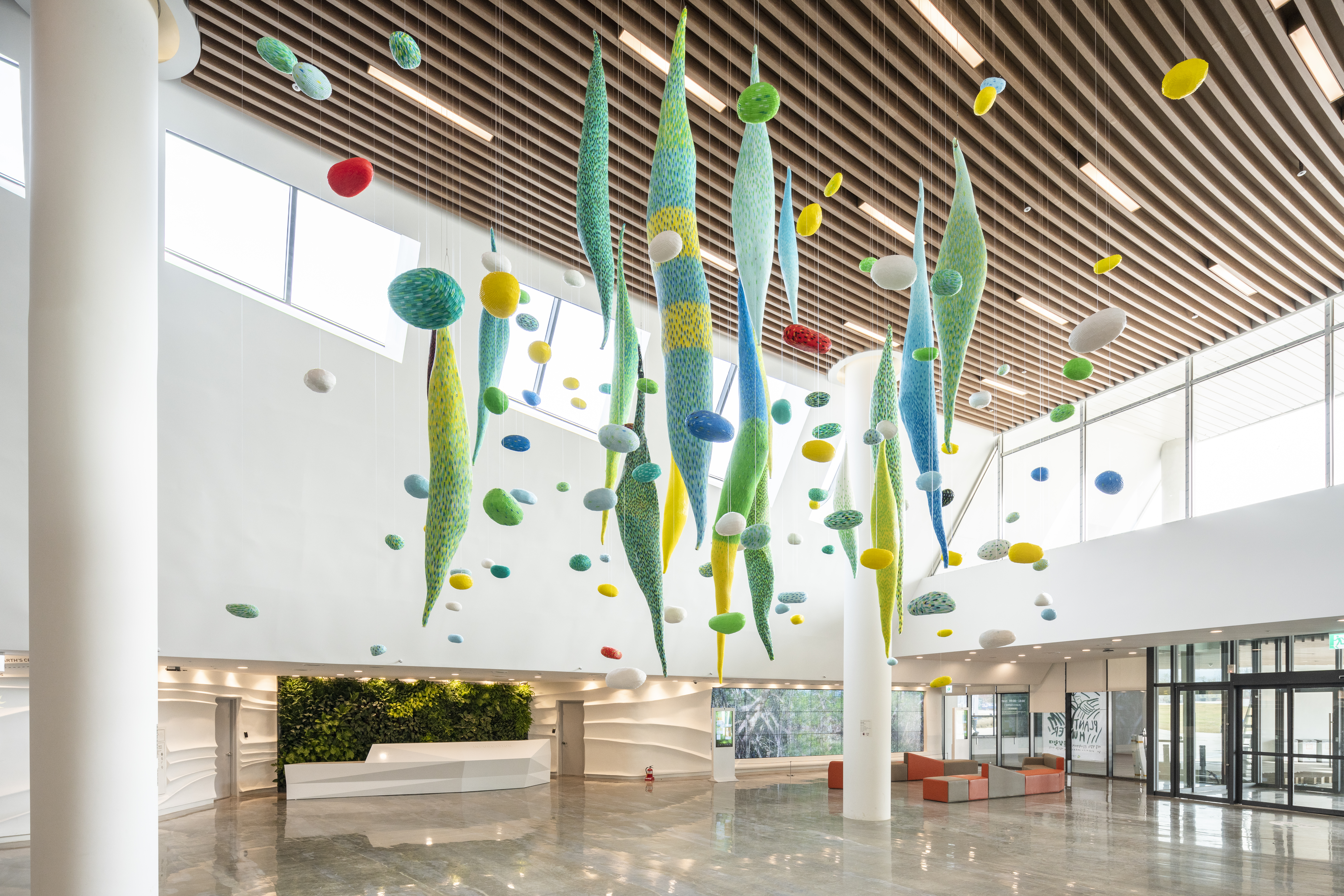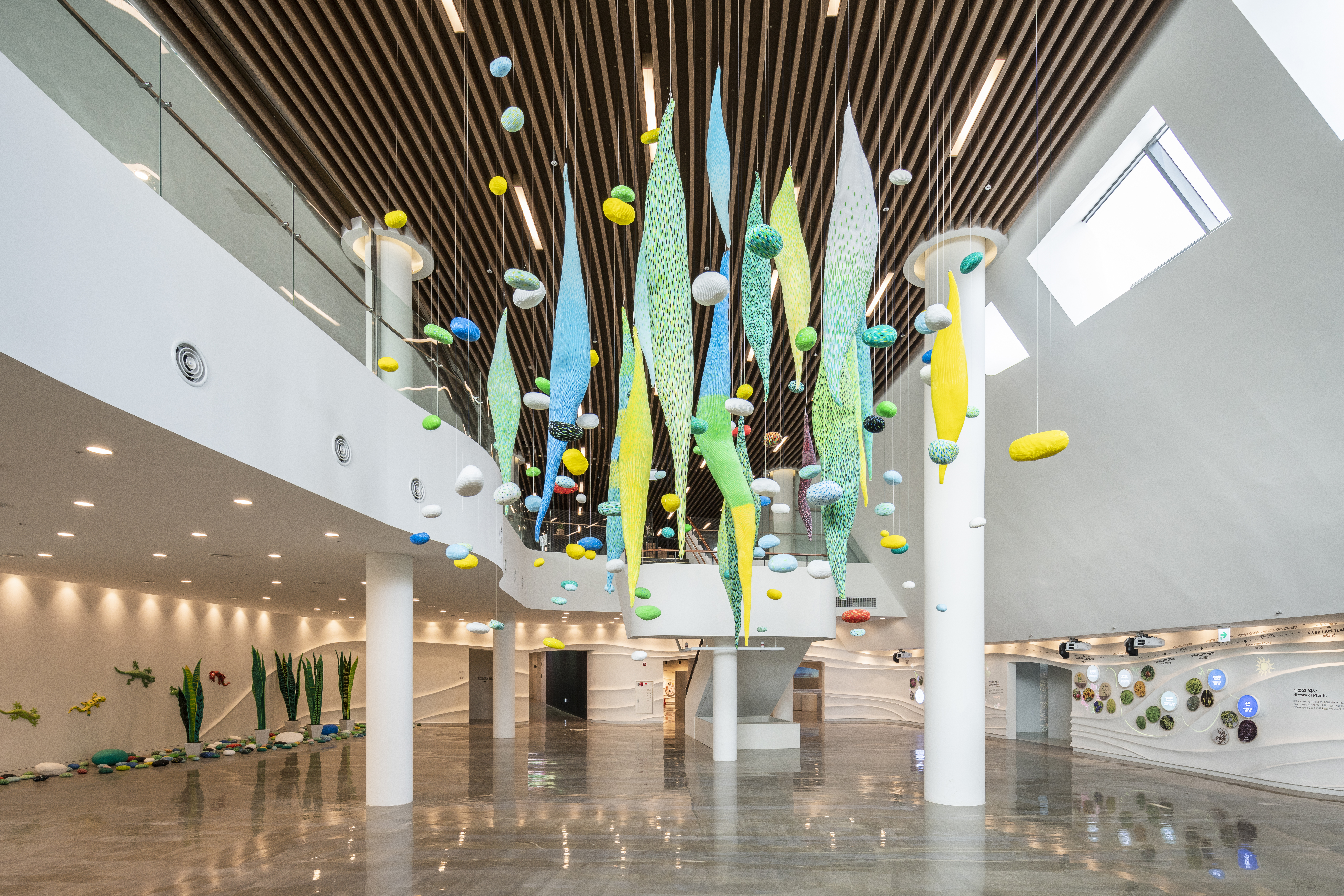 식물문화센터 로비에 들어서면 전면에 보이는 정찬부의 <피어나다>는 초록, 파랑, 노랑, 빨강 등 생동감 넘치는 색으로 구성되어 중앙 천장에 매달려 있습니다.