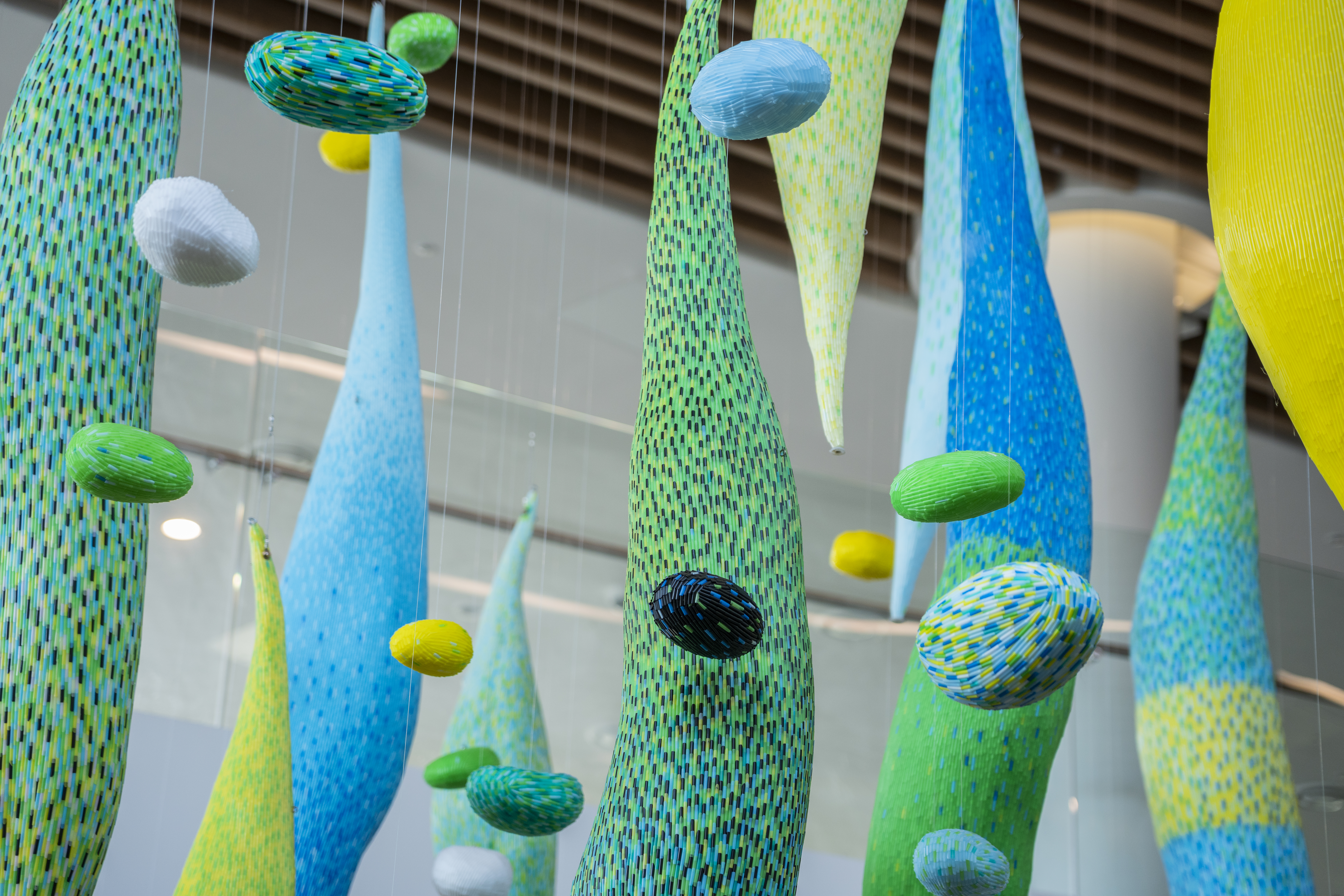 가까이 가보면 우리는 그제야 그것이 플라스틱 빨대임을 알게 되는데, 짧게 자른 빨대를 집적시킨 형태는 무한 증식하는 세포처럼 보이기도 합니다.