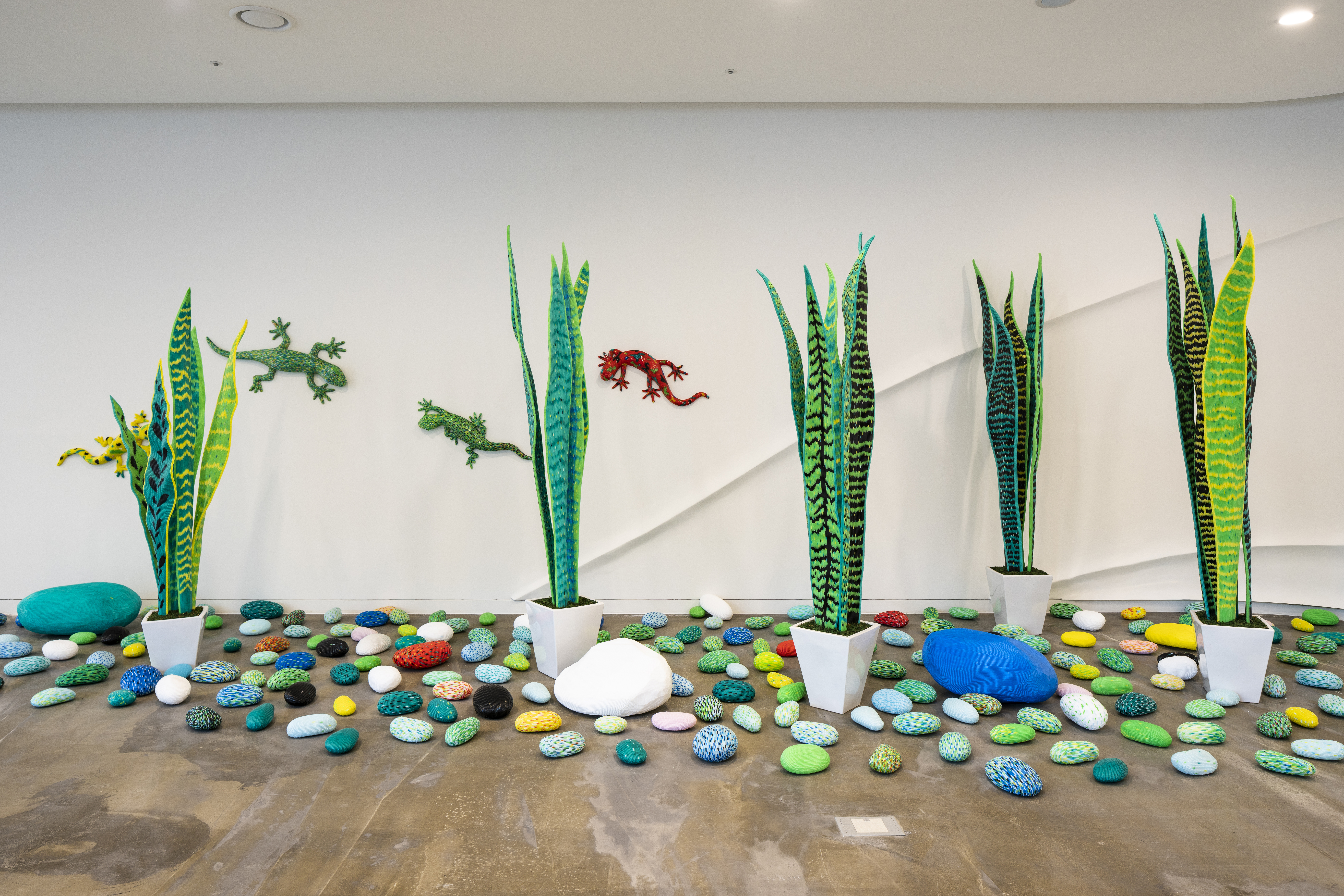 로비 왼편에는 산세베리아 화분들 사이에 돌이 깔려있고 벽면에는 도마뱀이 기어 다니는 것처럼 보이지만 이것은 빨대를 사용해 작가가 조성한 인공정원입니다.