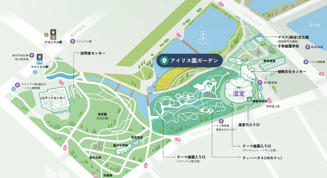 アヤメ、ハスの花、ヤナギの木などと水の音が調和するアイリス園は、心身共にリラックスできる癒しの水生植物庭園です。